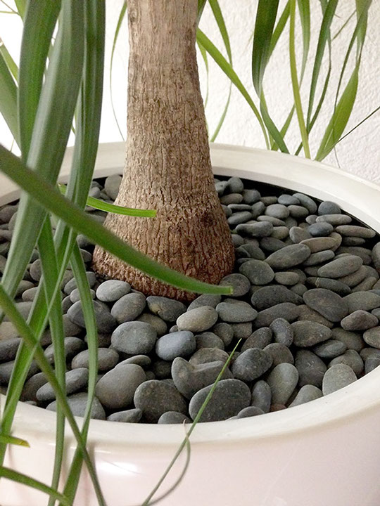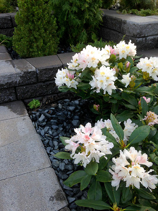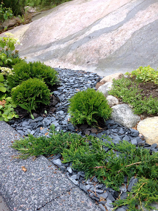 Havuistutus kallion juurella katteena liuskekivimursketta.